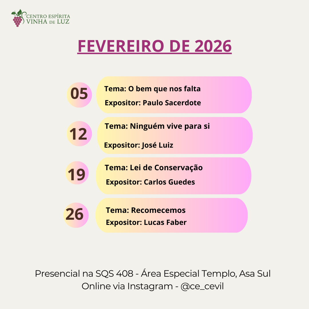 Estudo das Obras Básicas, palestra pública e mocidade. Conheça mais na aba "Atividades"